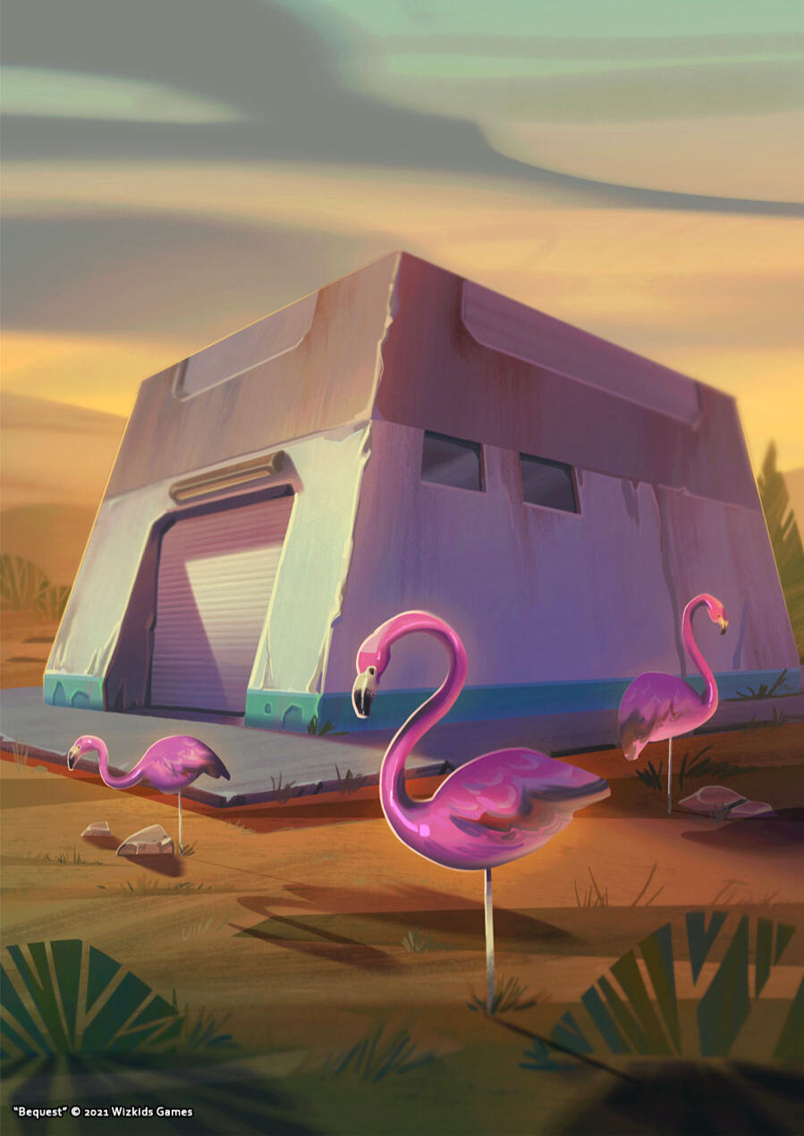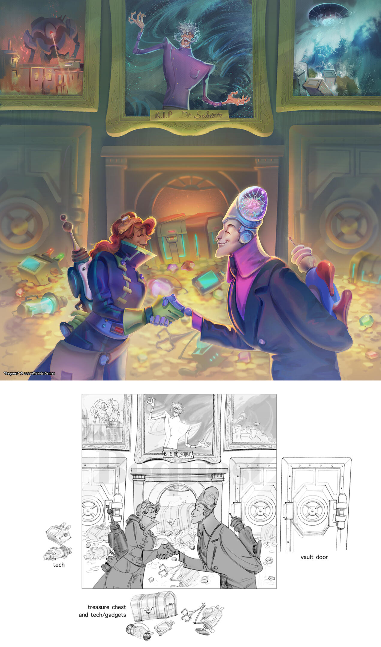I had a freelance opportunity to design and make art for a board game called BEQUEST, a quirky and villainous divide-the-loot card game.